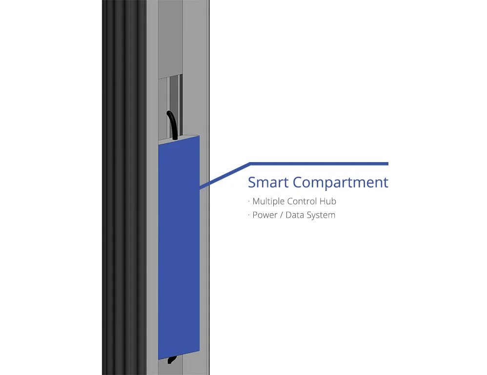 I.CORE™ is the backbone of the IoTPole. The concept expands into the idea of modular smart panels and dedicated access, whereby different functional control panels compartments and wiring passageways can be further segregated for their individual needs.